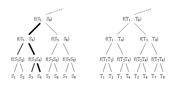 So to find the changed nodes, we start by comparing the roots of the two trees. Since they are different, we check all their children. In the example above S4 has been changed and is now different from T4. The left child of the top node in the tree above is different, so we check its children etc. We have shown two types of bold edges in the figure. The lighter bold edges indicate nodes that were checked. The heavy bold edges show nodes that were checked and found to be different. Eventually, we arrive at all the changed leaves. The time to find k changed nodes is O(k log n).