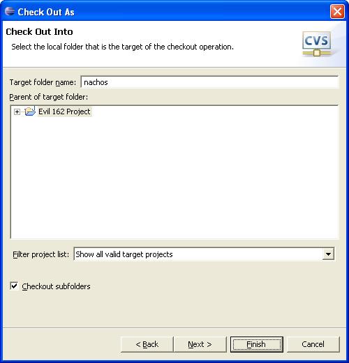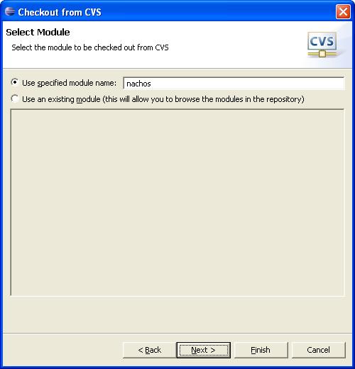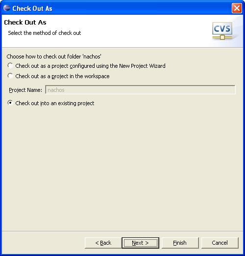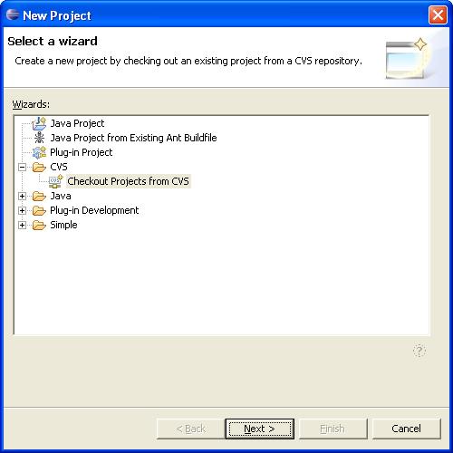 Next, you need to check out Nachos from CVS. You can cheat and do this from the new project screen. Select the Checkout Projects from CVS wizard as shown: