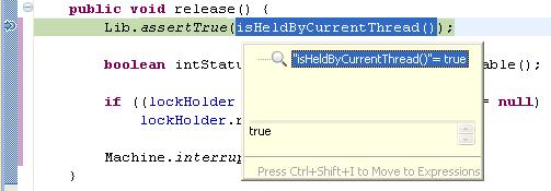Value inspection: Another trick when Eclipse is paused is that you can evaluate the result of any expression that is in scope. Just highlight an expression, right-click, and Inspect it (or type Ctl-Shift-I):