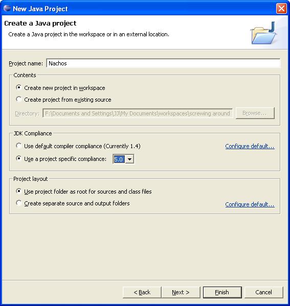Give the project whatever name you want. Nachos is kinda boring. It could very well be Evil 162 Project, or Nachos, eater of sleep. You don't need to use Java 5.0 (also known as Java 1.5), but templates and foreach loops can come in handy sometimes. Java 1.4 will work just as well. Be sure that everyone in your group agrees on what version of Java to use.