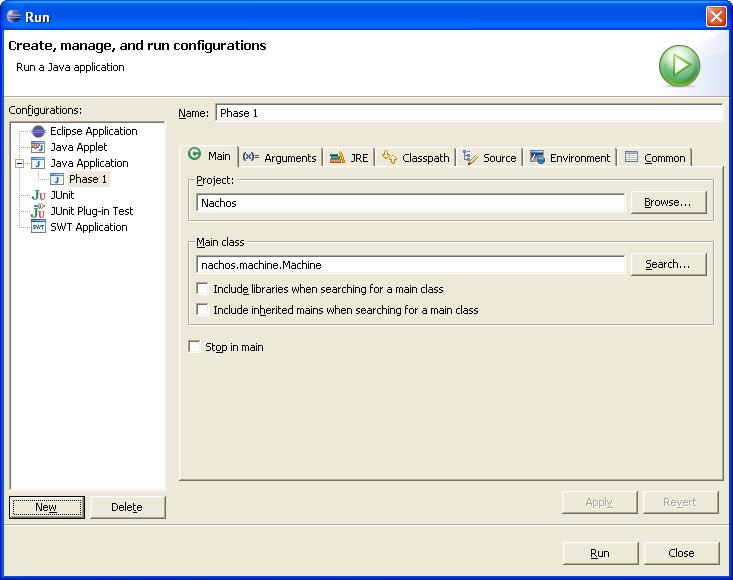 Now that you have run profiles, you can run Nachos! Go up to the run button (it's green and has a play symbol on it) and click the arrow to its right. You should see your run profiles there. Select Phase 1 and watch it go! The output is displayed in the Console view at the bottom.